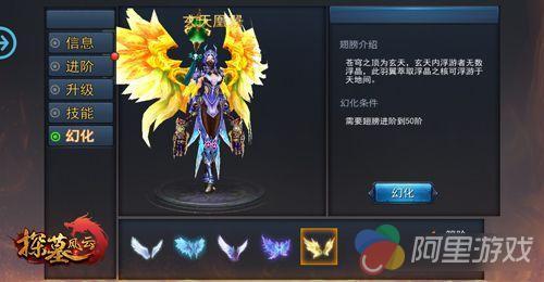 玄天凤翼:羽翼进阶到50阶可解锁,玄天凤翼代表着目前羽翼最高形态,亦拥有目前羽翼最大的翼展,通体金黄,耀眼非凡,此为王者之翼!
