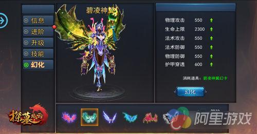 碧凌神翼:碧凌神翼以绿色为主色,黄色为辅色,比起其他羽翼它显得更为稳重淡然,但极高的羽翼高度也象征了它的地位非凡;属性加成与幻枫凌翼持平相同。