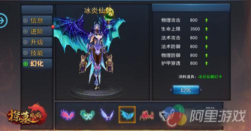 冰炎仙翼:获取方式十分不易,通体蓝色,散发幽幽冷光,特效 华丽,属性加成也有了质的提升;物理攻击+800、生命上限+3500、法术攻击+800、法术防御+800、物理防御+800、护甲穿透+800。