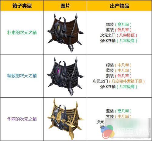 宝箱分为华丽的次元之箱、精致的次元之箱、朴素的次元之箱三种,每种宝箱又分20级、30级、40级、50级宝箱,打不同等级和不同种类的宝箱可以获得不同等级和品质的装备。以20级箱子为例,华丽的次元之箱有机会爆出D20蓝紫装,精致的次元之箱有机会爆出D20绿蓝紫装,朴素的次元之箱有机会爆出D20绿蓝装。还都会有几率掉落装备、强化卷轴,是每位走向强者之路必备的物品!
