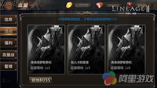 与攻城战不同,血盟狩猎是一种PVE玩法。当血盟到达一定等级后,将会开启对应的血盟狩猎Boss,盟主通过血盟商店购买狩猎凭证便可开启Boss狩猎场景,此刻所有血盟成员都可进入场景共同狩猎,击杀血盟狩猎Boss后会掉落与大世界狩猎Boss同样的奖励。当然血盟狩猎是有次数限制的,各个级别的Boss每天只可击杀一次。当你拥有了一座领地后,可以开启对应领地的领地狩猎玩法。与血盟狩猎一样,狩猎成功后将获得与该领地世界boss一样的奖励。