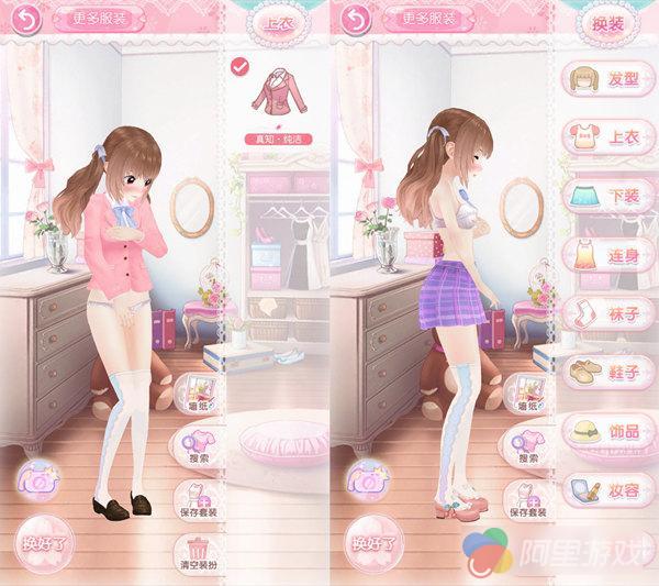 值得一提的是,游戏在细节上的设计真的能让人眼前一亮。比如玩家只给甜甜穿了上装,还没来得及换下装的时候,她会害羞的脸红起来,摆出这样不好意思的动作真是让人怜爱呢。此外,当你想为换好装的甜甜拍照时,只要点击游戏中的拍照按钮,她就会自己摆出各种 Pose 让你拍。我们的甜甜不宅的时候也是非常活泼可爱,古灵精怪的。