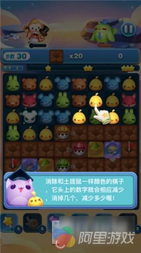 童年记忆中,又怎么少得了“打地鼠”这个小游戏呢?地鼠从地洞钻出来时,便需要用锤子狠狠的敲击。不过在新版游戏中,土拨鼠会帮玩家消除土块,扩大棋盘。在游戏中,每只土拔鼠头上都戴着一顶帽子,帽子有着不同的颜色以及对应的数字。玩家只有消除跟土拔鼠帽子同颜色的棋子,帽子上的数字才会减少。消除几个棋子,帽子上的数字就减少相应的数量,当数字减少到0时,土拔鼠就会帮玩家消除一块土地,并按照箭头所示的方向移动一格。