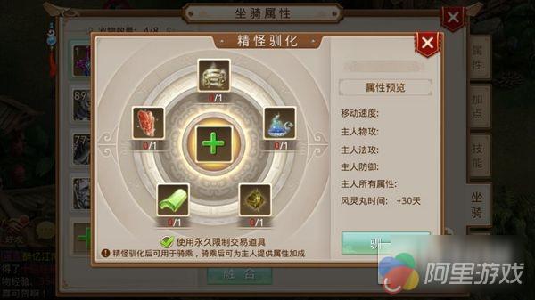 坐骑系统里的坐骑分为精怪和御灵,精怪为一种特殊的宠物,即可像普通宠物一样用于作战,又能给自己的主人增加各种属性值,驯化为御灵后还可用于骑乘。玩家们可以花费一袋精怪诱饵和相应金钱前往东海渔村玉真子处召唤精怪,还有机会获集齐精怪灵物拘首环、困灵砂、驱力刺、定鞍石、控心玉在玉真子处将精怪驯化成御灵后道友即可骑乘御灵驰骋天下了,还附送 30 天风灵丸时间。