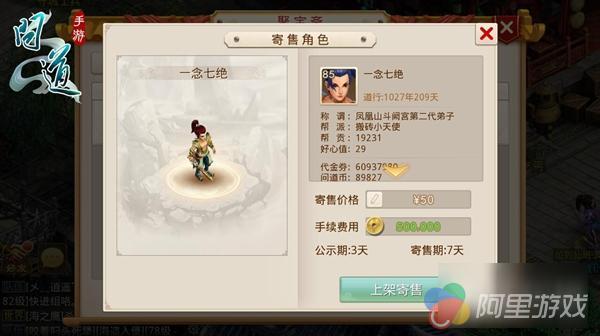《问道》手游 2016 年度版公测后,在游戏内界面左侧的交易选项中新增了聚宝斋入口,玩家在这里可以十分方便的进行当前角色的公示和寄售工作。上架角色需要支付一定的手续费,寄售成功后角色即进入7天公示期,公示期的角色可以被买家浏览到但是无法购买;公示期结束后角色即进入 14 天的寄售期,此时角色就可以被自由购买了。需要注意的是,只有等级大于等于 70 级的角色才能寄售。