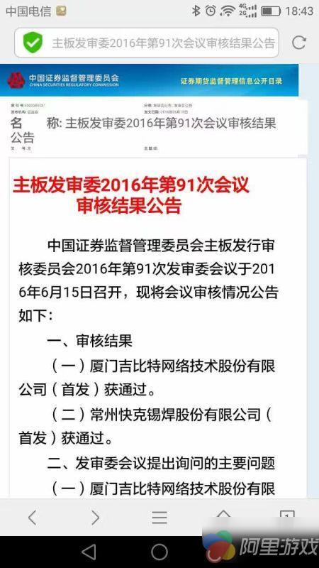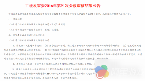 九游6月15日消息,今日证监会发布了《主板发审委2016年第91次会议审核结果公告》(下称“公告”)。公告中,证监会表示厦门吉比特网络技术股份有限公司(首发)获通过,吉比特正式A股上市。