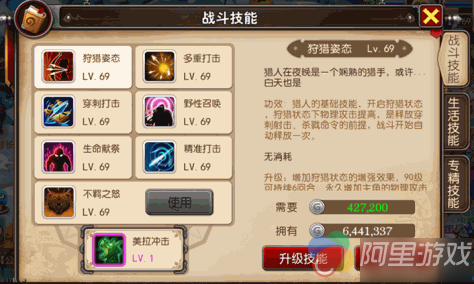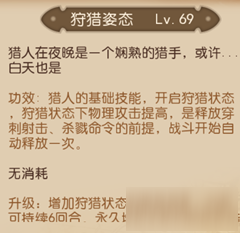 | 狩猎姿态 | 猎人的基础技能,开启狩猎状态,狩猎状态下物理攻击提高,是释放穿刺射击、杀虐命令的前提,每次战斗开始自动释放一次 | 增加狩猎状态的增强效果,永久增加主角物理攻击,升级增加持续回合 |