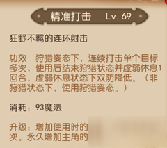| 精准打击 | 狩猎状态下,连续打击单个目标多次,使用后结束狩猎状态并虚弱休息一回合,虚弱状态下双防降低。(非狩猎状态下,使用狩猎姿态) | 增加使用时的伤害,永久增加主角的生命,升级可增加打击次数 |