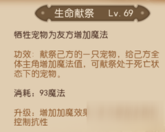 | 生命献祭 | 献祭己方一只宠物,给己方全体主角增加魔法值,可献祭处于死亡状态下的宠物 | 增加加魔法效果,永久增加主角的控制抗性 |