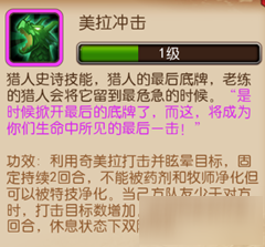 | 美拉冲击 | 利用奇美拉打击并晕眩目标,固定持续2回合,不能被药剂和牧师净化但可以被特技净化,当己方队友少于对方时,打击目标数增加。使用后虚弱休息一回合,休息状态下双防降低。 | 所有技能达到指定等级后解锁下一级 |