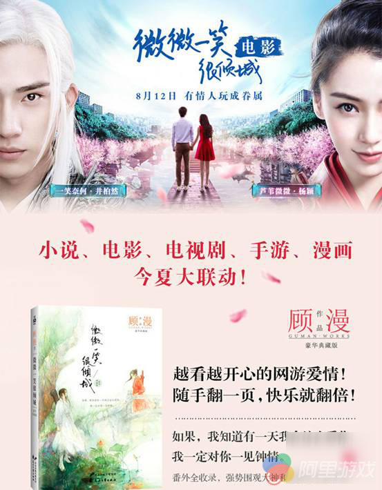 作为顾漫极负盛名的作品,《微微一笑很倾城》持续畅销八年,这一承载了90后心中单纯浪漫的网恋幻想的经典IP,在今年暑假先后以电影、手游、电视剧、漫画的形式呈现在上千万粉丝面前。8月12日,电影《微微一笑很倾城》上映后,票房逼近两亿;同日手游IOS一元上架,顺利登陆付费榜前三,成绩亮眼;8月19日,手游《微微一笑很倾城》全平台公测,顾漫独家授权同人剧情番外篇终极预告上线;8月22日,电视剧《微微一笑很倾城》将在江苏卫视、东方卫视首播。2016年度最值得期待的“电影+手游+电视+漫画+小说”五线同期联动IP《微微一笑很倾城》霸屏来袭!