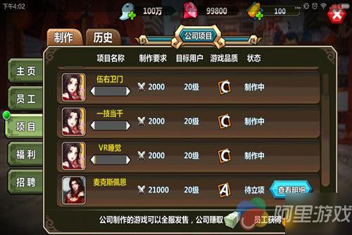 开发不同等级的游戏对玩家的战力要求各不相同。当然,越好的游戏在研发成功后会有更高的收益,对公司(公会)的帮助也就越大。而完成一个游戏项目,需要公司(公会)中玩家们共同的合作,通过每日捐献资源来提高游戏项目的完成度,贡献的资源可在武侠世界中通过公会任务和据点争夺获取。一款游戏是否能快速的研发完成,与玩家贡献资源的速度有密不可分的关系。如果同时进行多个游戏项目,而贡献资源的速度比较慢的话,可能会导致游戏项目长时间不能上线。所以,如何更好的分配公司员工、对资源最大化的利用,是需要管理者合理计算的。