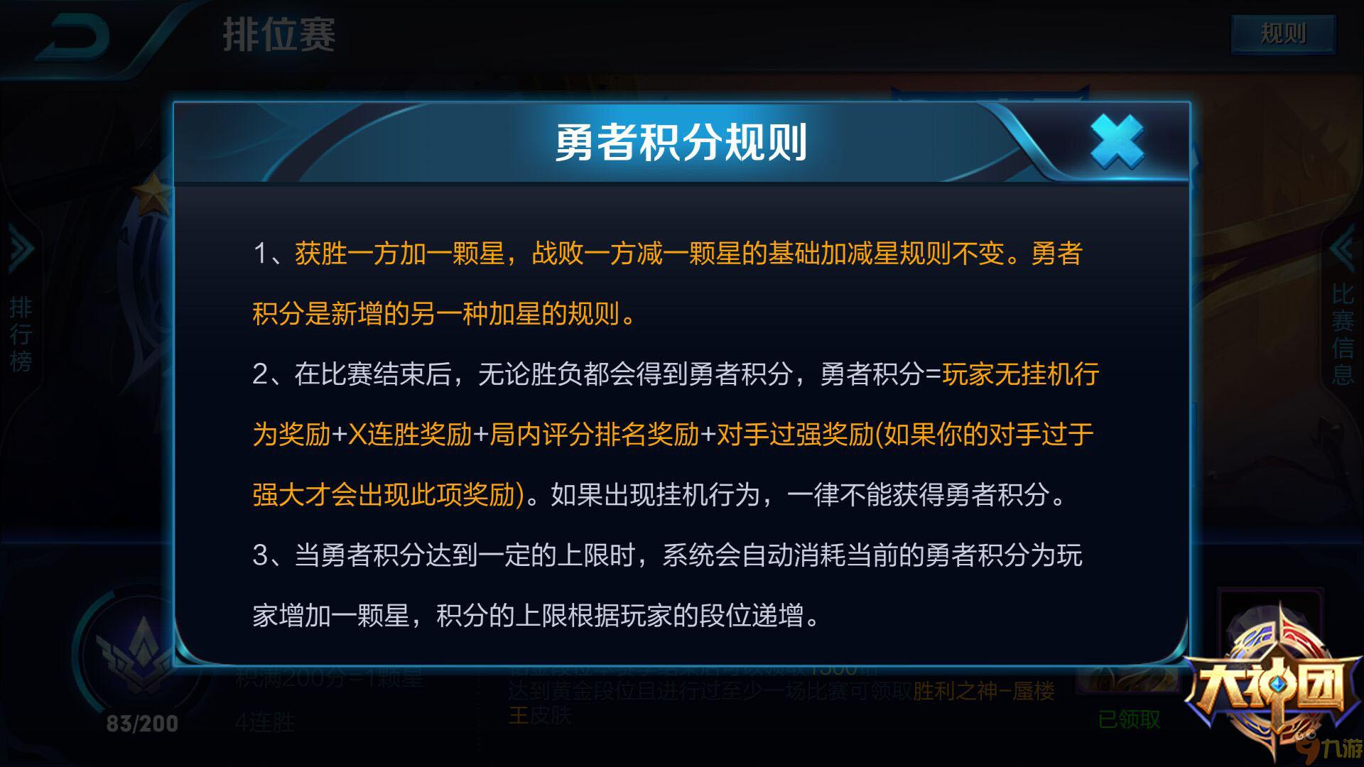 原来的连胜加星的系统由勇者积分系统替代。勇者积分是新增的另一种加星的规则。在每场比赛结束后,无论胜负,系统都会通过玩家是否有挂机行为、局内表现排名的分数(根据玩家的KD比和经济进行排名)、对手强弱、连胜场数这4项参数给予玩家一定的勇者积分。