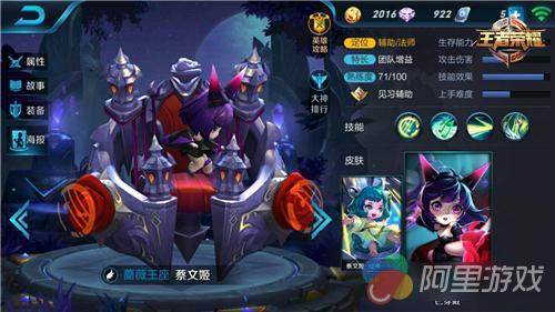 蔡文姬刚刚登场的可爱小萝莉,萌萌哒的造型一看就是个好辅助。一位释放技能时自带BGM的英雄。(哼!没有人能在我的BGM中打败我。)可能是新英雄的关系,在现在的高端局中登场率不是很高,但路人匹配中基本一场比赛两个蔡文姬。不管是路人还是大神都在练习蔡文姬。自身技能有回血有加成还有控制,大招开启后配合技能净化,还能用来切割战场。用不了多长时间,蔡文姬就会在排位中活跃起来。