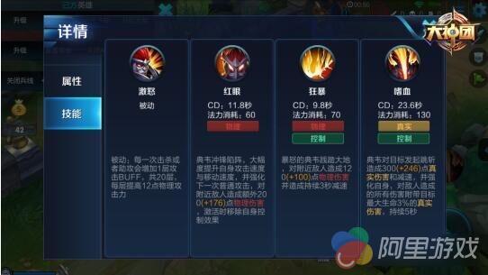 技能解析:典韦的核心技能,真实伤害,无视防御,增强自身,并且5秒的3%真实伤害,推荐一开始就对敌人使用,这样能使自身伤害最大化。