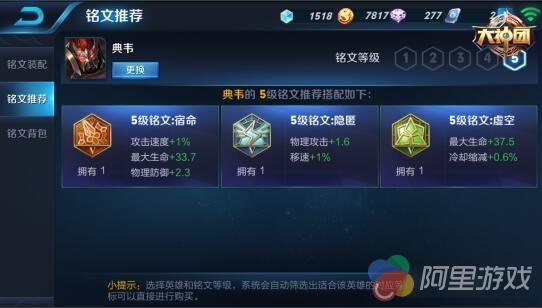 铭文解析:铭文等级5级,红色铭文:宿命;蓝色铭文:隐匿;绿色铭文:虚空。铭文总效益攻速10%、物防23、生命712、物攻16、移速10%、冷却6%。如果没有5级铭文的话用4级和3级铭文过渡也可以。