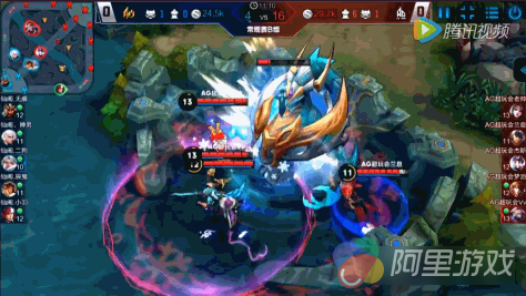 11分钟,超玩会抓野区的韩信,韩信残血逃生,但是超玩会顺势强拿大龙,由于韩信残血不敢抢龙。仙阁错失大龙。随后超玩会顺势拿下暴君并携带双BUFF一波强推高地。仙阁无奈由于经济差太大毫无还手之力。