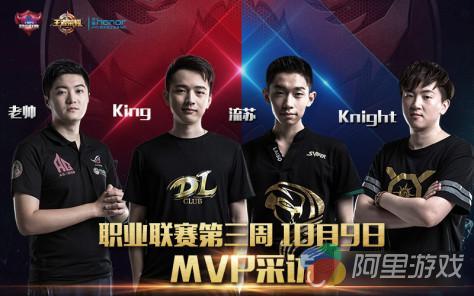 第三周次日,sViper与DL以2:0战胜WF与BWS。AG超玩会苦战仙阁再夺一分。而10月9日的焦点之战则落在XQ与eStar的巅峰对决之上,本周最佳黑马XQ让一追二战胜不败金身eStar,两队精彩绝伦的龙虎之斗也让人难忘!赛后,我们对sViper,流苏、AG超玩会.老帅、DL丶King与XQ丶Knight四位MVP获得者进行了专访!值得注意的是,XQ丶Knight成为KPL首位一周获得两次MVP殊荣的选手!