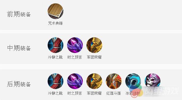 后期:冷静之靴 时之预言 军团荣耀 红莲斗篷 冰霜法杖 痛苦面具