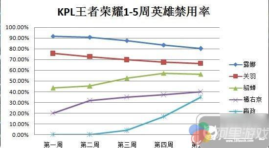 上图是KPL王者荣耀第1-5周的重要英雄禁用率,可以看到露娜和关羽遥遥领先,住在小黑屋里面基本不走了,就算是削弱也只是微微动摇了他们两的地位,夫妻双双把家还,小黑屋里聊天喝茶。接下来就是异军突起的橘右京和开发出半肉打法的貂蝉,禁用率也在稳步上升。是不是感觉少了点什么,是的还有我们的嬴政,禁用率一直很低,但是这并不影响他的强大,在9月的更新后,嬴政的被动与技能都被加强了一波,第二周中超玩会的老帅第一次拿出了这个英雄,瞬间将这个英雄带火了,在新版本更强调团战的情况下,嬴政拿到了出了属于貂蝉的第一法师之位。
