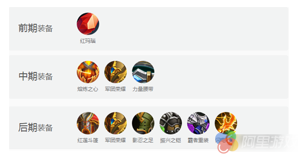 后期: 红莲斗篷 军团荣耀 影刃之足 振兴之铠 霸着重装 闪电匕首