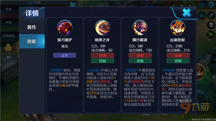 【大招:山崩地裂】:短暂蓄力后,牛魔以巨斧猛力劈开大地,击飞面前路径上的敌人,并造成物理伤害。同时沿途的大地被牛魔力量撕裂,持续5秒,踏入撕裂范围的敌人将遭受减速和持续伤害。