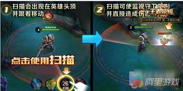 而使用扫描卫士的位置与监视技能的相同,但无需轮盘施法,直接点击扫描,即可释放扫描卫士,扫描卫士会出现在英雄的头顶,并跟随英雄移动。此外,使用扫描卫士可以使敌方监视守卫显形,只要敌方监视守卫暴漏在己方的扫描守卫范围内,即会持续掉血直到血量为0,然后消失。