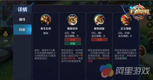 程咬金的被动以血量换取攻击力加成,血量越低攻击力越高;一技能为位移技能,附带减速效果,能为程咬金追杀或者逃生提供保障;二技能为范围伤害技能,是程咬金主要的技能伤害输出手段;三技能在短时间内大量回复生命值和移动速度,在与敌人拼得两败俱伤时开启此技能,敌人瞬间懵逼!