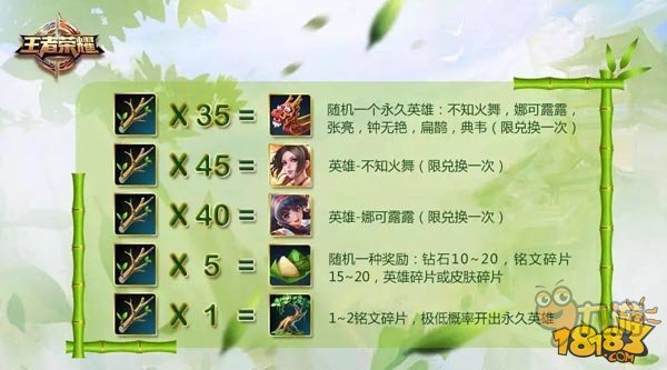 除了通过打开“粽子”来获取奖励外,玩家还可以在端午节期间搜集“端午:小树枝”来兑换奖励。6月6日至12日,4级以上的玩家每天登录即可领取“端午:小树枝”3个,用于参加树枝兑换活动。想要获取更丰厚奖励的玩家就需要在6月8日至12日参与5V5对战模式(包括匹配、排位、娱乐模式和赏金赛)来赢取更多的“端午:小树枝”。收集足够的“端午:小树枝”之后,玩家即可在6月8日至13日之间,前往活动界面兑换不知火舞、娜可露露等永久英雄及钻石、铭文碎片的奖励。