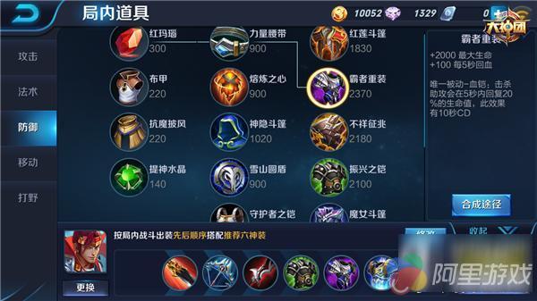 半肉装的韩信前中期先出好攻击装,到后期再来转型即可。军团荣耀、振兴之铠以及霸者重装都是不错的选择,首先是军团荣耀,团队型装备,能为友军提升物法防御。如果己方有坦克出到这个装备,那么韩信可以选择出振兴之凯增加一定的魔抗。而且振兴之凯提供冷却缩减属性外,配合回血装备能提高韩信的续航能力。霸者重装则是可以大幅度提升韩信的生命值,完成击杀或者配合队友击杀,都会触发血凯的被动效果立马回复生命值,更是让韩信越战越勇。