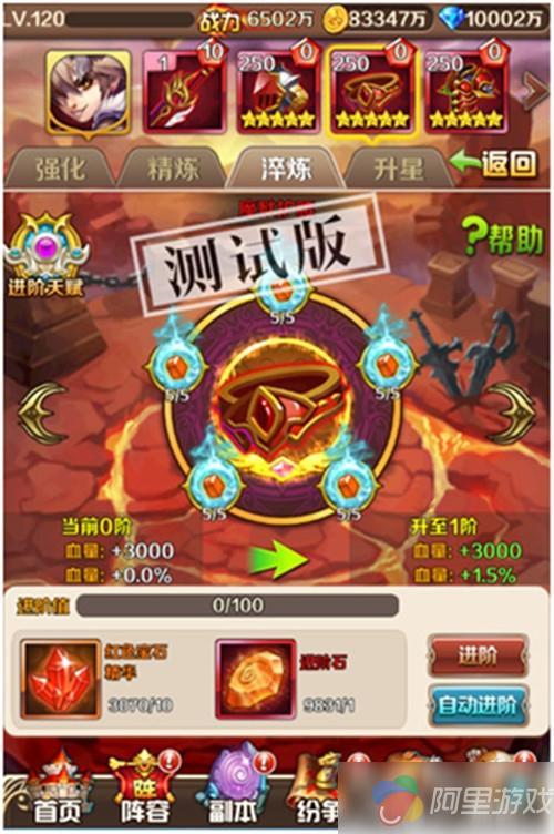 “宝石系统”只有橙色及橙色以上的装备才有,若拥有橙色及以上武器,在装备列面查看装备宝石淬炼系统!游戏橙色装备自带4个宝石,红色装备自带5个宝石!不同装备上的宝石拥有不同的属性加成,如武器上的宝石是增加攻击力,而盔甲上的宝石则是增加防御力。每一个宝石,第一次淬炼只能升到第五级,当装备上所有宝石都升到第五级时,则此装备可以进阶。进阶消耗一定数量的进阶石,进阶操作每次会增加一定的进阶值,当进阶值达到100%后可以提升宝石等阶,进阶过程中还可能直接进阶哦,进阶后的装备,会激活进阶的额外属性,而且每一颗宝石淬炼上限都会提高,再次达到上限后,又能再次进阶,宝石的进阶将人物的战斗力将飞一般的增长哦。