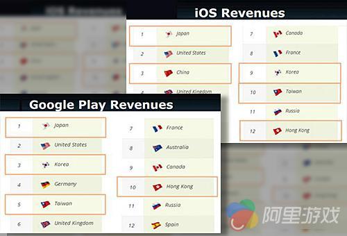 而GooglePlay上的统计更为惊人:按收入计算,台湾排在全球第5,高于英国和法国;而香港则位居第10,领先于西班牙、意大利,甚至俄罗斯!