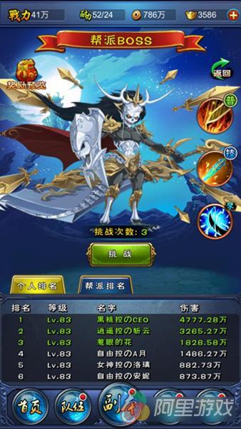 在已有的帮派系统界面中,有帮派佣兵、帮派建设、帮派管理、帮派商店以及新增的帮派BOSS五个功能,帮派BOSS功能位于最顶端,点击进去后便可以进行挑战,每个玩家每天有3次挑战机会。帮派BOSS拥有3个天赋,3种天赋会每日随机出现,玩家可以适当根据BOSS出现的天赋来调整阵容,从而打出最高伤害。。