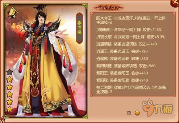 李世民从主技能伤害、被动技能、宫廷缘分来看,基本就是我大乔妹的女装版,替换了2条缘分,一条是把大乔妹的“江东美人”全技能+4,变成了壕壕壕的“四大帝王”全技能+6,还有一条是把装备中的玉缘分从防御变成了会心,输出更加纯粹。凑齐5条输出缘分是时召唤神龙了。