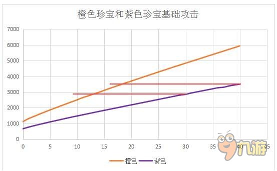 由上图可以看出,突破30的紫色珍宝加的基础攻击相当于突破13左右的橙色珍宝,突破40的紫色珍宝相当于突破18左右的橙色珍宝。只计算基础属性,紫色珍宝突破40都比不过突破20的橙色,但是不要忘了还有突破属性。