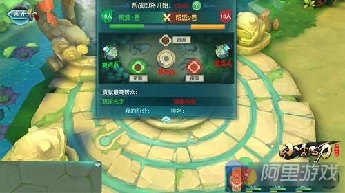 凡开服超过七天的服务器的帮派均有资格报名参加帮派战,报名帮派中的每一位帮派成员都可以为帮派战出力。在实战中,每位帮派成员最多可设置3套出战阵容,参与争夺帮战地图中的资源点。玩家占领的资源点越多,则帮派获取积分的效率越高——只要抢先积累到300积分的帮派,便可赢得该场帮战的胜利。