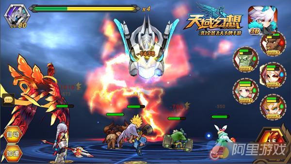 厌倦一成不变的战斗模式?想在卡牌手游中感受一把MMO近距离对战的超爽体验?《天域幻想》除了主线副本外,在“幻境”系统中,一改传统人物对战角度,上线多种正面角度对战模式,超强BOSS正面来袭,神将技能炫酷出击,感受不同角度未曾有过的战斗体验! 就如《天域幻想》每日12点准时开放的“进击的魔神”, 在“进击的魔神”中玩家面临的最凶狠BOSS是“千灵银蝠蛟”,其拥有三个战斗阶段,每个阶段都会拥有不同的变身技能,应对这类BOSS则像MMO端游一样需要更多的策略性。想要完全征服它,就一定要在阵容中带上可以妙手回春的奶妈和足够强韧的肉盾,这样才能有机会平稳度过第二阶段并应对boss恐怖的第三阶段变身,获得最终战斗的胜利。