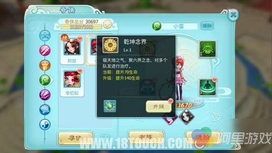 小蛮的特殊技能是乾坤念界,此技能可以对多个队友进行治疗。其他三个技能是蚀天、烟水还魂、刃风壁。