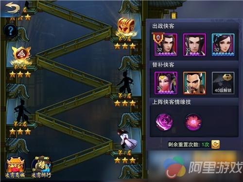 玩家在正式挑战凌霄宫之前需要搭配好自己的冲锋阵容,玩家最多可同时上阵三位侠客,但允许携带替补侠客,玩家等级越高可携带的个数越多,上限为三个。替补侠客在已上阵侠客阵亡的一瞬间出战,因此玩家在选择替补侠客的属性时依然要仔细考虑,若是属性不均衡容易产生短板,无法挑战的长远。