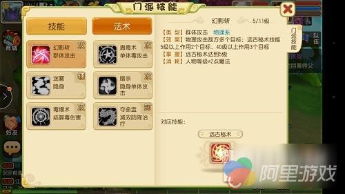 幻影斩:群攻;蛊毒术:单体,几率可附加中毒效果;迷雾:隐身;暗杀:隐身状态下使用,提高暴击和伤害;毒爆术:单体可引爆中毒;夺命盅:封印,提高敌方所受伤害且减治疗效果。