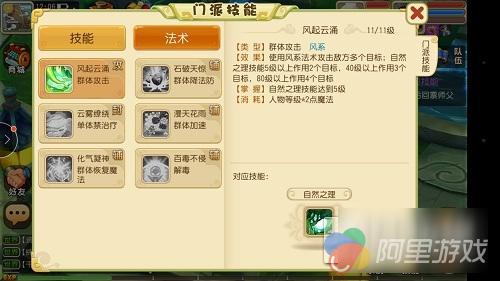 风起云涌:风系群伤;石破天惊:群体减益魔抗;云雾缭绕:封印,无法接受治疗;漫天花雨:群增益,提升速度;化气凝神:群增益,回魔法;百毒不侵:单辅,清除中毒。