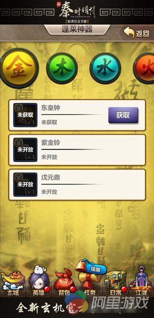 这就是我们点进去以后会首先看到的主界面了,分为金木水火土五个选项。里面每个神器的属性和所适合的角色类似都有不同,当我们点进去以后看的界面是这样的。