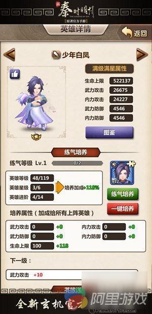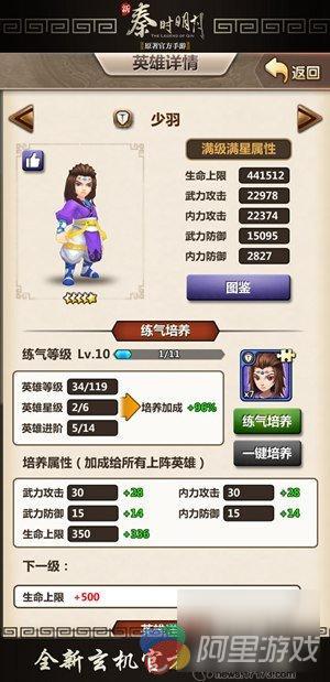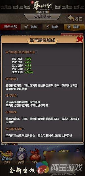 所谓练气培养系统,是指玩家们可消耗英雄信物在已经获得的英雄身上,提升该英雄练气等级。随着练气等级的上升会给玩家的整个队伍增加不同的属性。其中包括武力攻击、内力攻击、武力防御、内力防御和生命上限5个方面。