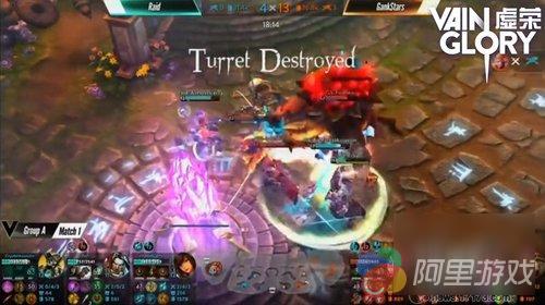 比赛开始,Raid极具进攻性,在中央野区和线上分别对GS进行了突击骚扰,此后在2分半时,由于Raid亚丹孤军深入GS野区,被GS魔狼、盲豹联手击杀。随后五分钟左右,线上舞司残血守塔,被丝凯伊一技能联合亚丹越塔击杀。此时双方人头比及经济相差不大。