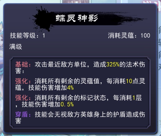 强-蝶灵神影:对自身终结技进行强化,学习后,战斗中变身前、变身后终结技伤害得到大幅度提升