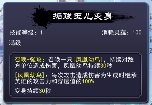 变身后终结技效果:召唤出一只凤凰幼鸟,持续对敌方单位造成伤害,凤凰幼鸟每次攻击造成伤害为生成时继承英雄的攻击力和穿透值的100%,凤凰幼鸟持续30秒。玉儿变身持续30秒