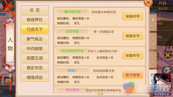 在御剑世界中,玩家能获得的称号可谓五花八门,包括修身养性、行迹天下、聚气炼法、所向披靡、威震五湖、青史传名、情缘师徒七种类型在内的上百种称号彰显你独一无二的心路历程。无论是攀升等级锻炼体魄,还是完成特定任务、斩杀指定的敌人,都能逐渐解锁相关称号、留下功与名、在旅途中挖据不同的乐趣。