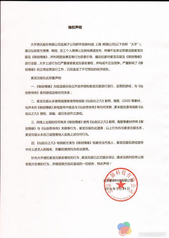 针对大宇资讯的近期言论,今日,紫龙互娱宣布声明,已正式向法院提起诉讼,起诉大宇资讯侵犯紫龙互娱名誉权,并构成不正当竞争。
