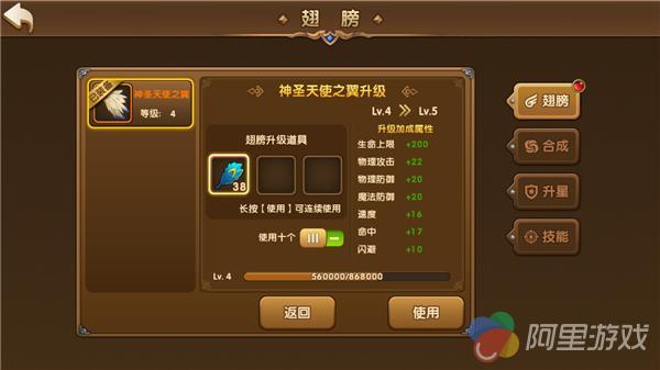 翅膀没升一级,都可以提高各项属性,如果有了新的翅膀,还可以对旧翅膀进行重生来返还所有的经验道具。