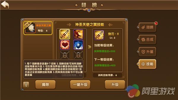 通过各种活动收集翅膀技能书后可以学习翅膀技能。通过分解技能书可以获得技能残章对技能进行升级。